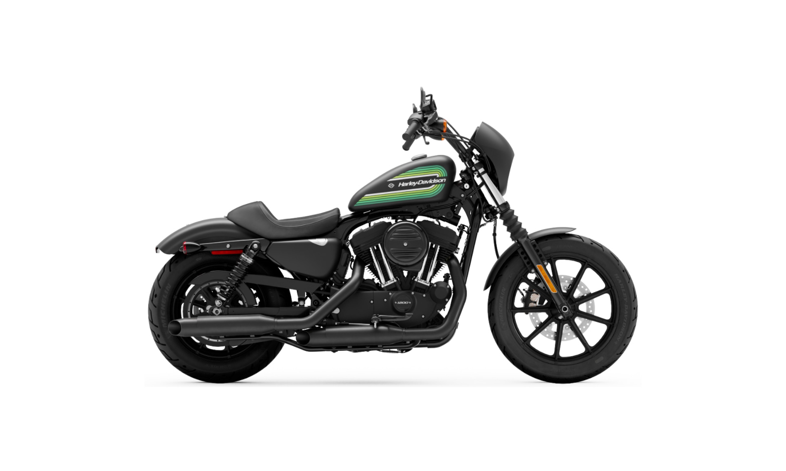 Nine-spoke wheels that are black as night from rim to rubber to complement the Dark Custom look.